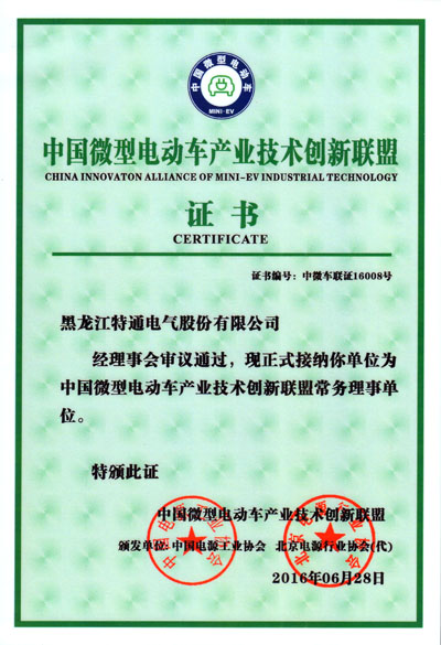 特通電氣各項(xiàng)標(biāo)準(zhǔn)符合中國(guó)電源工業(yè)協(xié)會(huì)的要求,并成為“中國(guó)微型電動(dòng)車(chē)產(chǎn)業(yè)技術(shù)創(chuàng)新聯(lián)盟”會(huì)員單位。