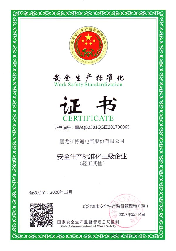 為建立、實施、保持和持續(xù)改進特通公司的安全管理體系,有效控制生產(chǎn)作業(yè)過程中的安全風險、提高安全績效,根據(jù)《中華人民共和國安全生產(chǎn)法》、《冶金等工貿(mào)企業(yè)安全生產(chǎn)標準化基本規(guī)范評分細則》、《工貿(mào)行業(yè)企業(yè)安全生產(chǎn)標準化建設(shè)實施指南》等相關(guān)法律法規(guī)標準,在哈爾濱市安全生產(chǎn)監(jiān)督管理局領(lǐng)導的幫助下,通過公司各部門的努力合作,特通電氣順利取得安全生產(chǎn)標準化認證。